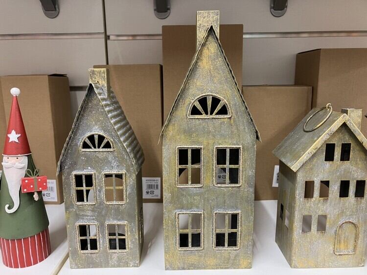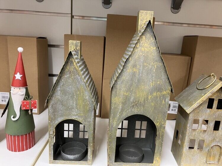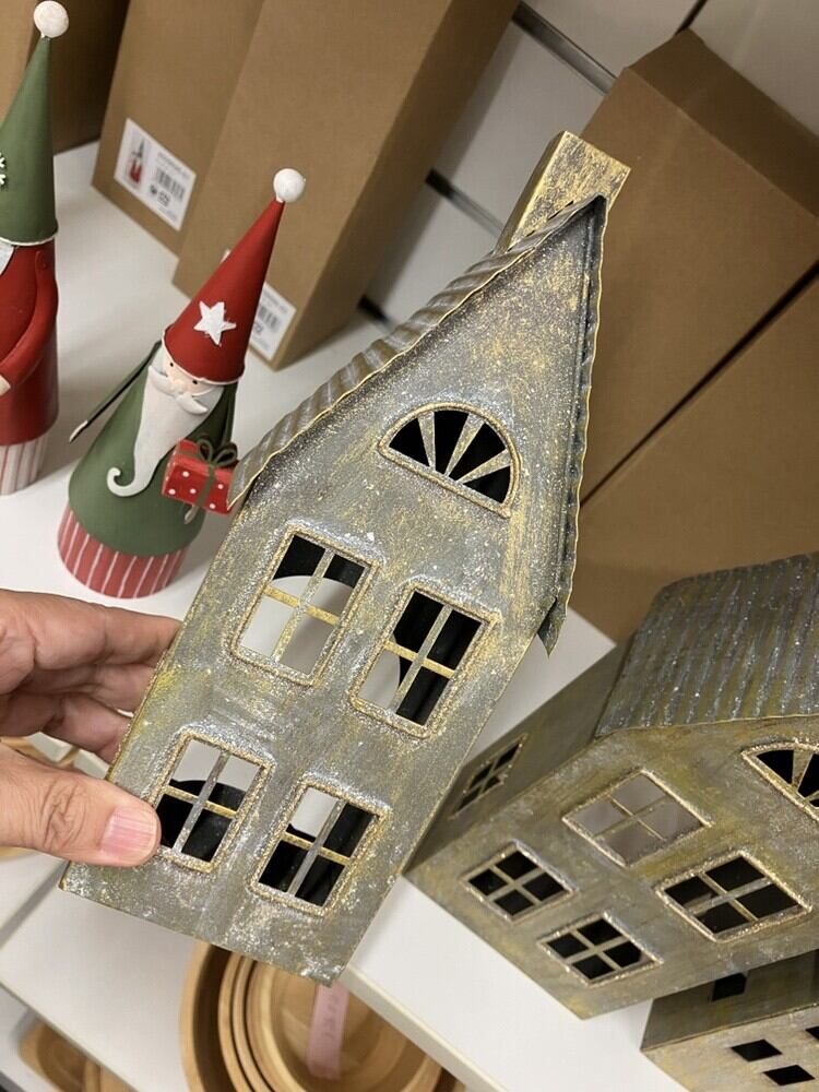 ブリキのお家後が大きく開いていて、ティーライトキャンドルホルダーが付いてますLEDティーライトキャンドルなどを使用すると窓から明かりが漏れて暖かい雰囲気になります